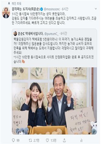 최문순 강원도지사가 개인 트위터 채널을 통해 코로나19로 출하에 어려움을 겪고 있는 강원감자 판매에 나선 첫 날 5,000여 건의 구매 접수로 온라인 구매사이트 서버가 다운되는 등 뜨거운 호응을 이끌어냈다.