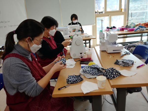 코로나19가 확산됨에 따라 마스크 수급이 어려운 때, 지역 내 소외계층이 안전하게 사용할 수 있도록 세탁이 가능한 면 소재를 이용해 마스크를 완성하기 위해 총력을 다하고 있다.