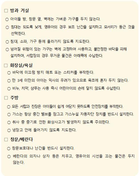 어린이와 고령자 등에서 지속적으로 발생하는 가정 내 안전사고 예방을 위해서는 침대 낙상 방지용 보조 난간과 모서리 부딪힘 방지용품 설치 욕실 바닥에 미끄럼 방지 스티커 등을 부착하고 생활 반경 안에 설치된 가구나 가전제품 등의 위험 요소를 주기적으로 점검하는 등 안전사고 예방을 위한 적절한 조치가 필요하다.