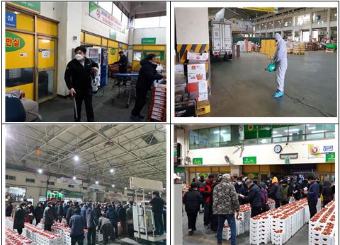 농산물 도매시장과 공판장에서 출하자, 소비자의 왕래가 많은 경매장, 작업장, 출입구에 손소독제 비치하고 예방안내 포스터 부착, 경매 개시 전에 경매사, 중도매인 등 출입자의 마스크 착용을 의무화하고 - 2월 24일부터 상황 종료 시까지 매주 1회 이상 방역업체가 집중소독을 실시하는 등 도매시장 전역에 고강도 방역을 진행하고 있다.