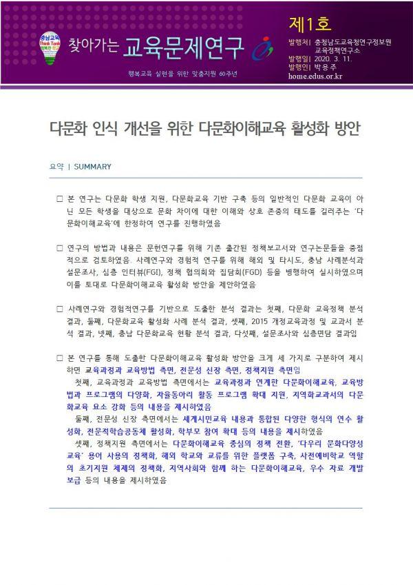 충남교육청 교육정책연구소는 ‘찾아가는 교육문제연구’ 제1호를 11일 발간했다.