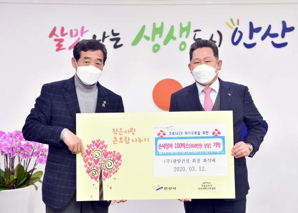 안산시는 ㈜광양종합건설에서 코로나바이러스감염증-19 확산 방지를 위해 사용해 달라며 휴대용 손소독제 1천200개을 전해왔다고 13일 밝혔다.