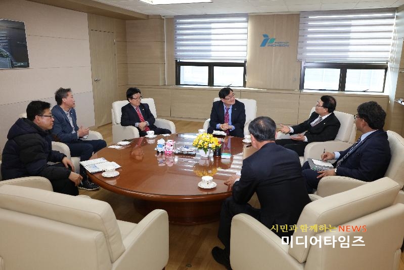 | 인천항만공사 사장과 취임인사를 나누고 중구의 현안사항에 대해 회의모습. <ⓒ미디어타임즈> |