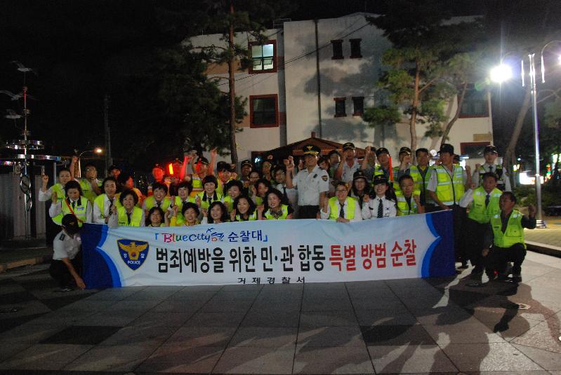 거제경찰서(서장 김영일)는 지난 21일, 추석 특별 방범 활동의 일환으로 자율방범대, 여성명예소장, 시민명예경찰 등 경찰협력 단체원 50여명과 경찰관으로 구성된 BLUECITY 순찰대가 “민․관 합동 특별방범 순찰”을 실시했다.