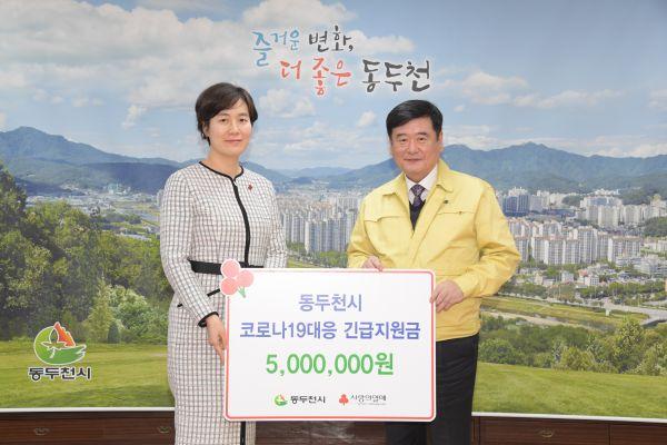 경기북부 사랑의 열매는 지난 12일 오후 동두천시를 방문해, 코로나19 예방 긴급지원비에 써달라며 500만원을 전달했다.