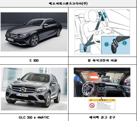 첫째, 메르세데스-벤츠코리아㈜에서 수입, 판매한 E 300 등 23개 차종 2만1760대는 앞 좌석안전띠 버클의 결함으로 사고 발생 시 좌석안전띠 기능이 정상적으로 작동되지 않아 탑승자에게 상해를 입힐 가능성이 확인됐고 GLC 350 e 4MATIC 등 5개 차종 2,567대는 운전석 햇빛가리개에 부착된 에어백 경고 문구가 안전기준에 부적합한 것으로 확인되어 시정조치에 들어간다.