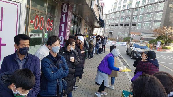 송탄동 관내 유일한 공적마스크 공급처인 코오롱하늘채 상가에 위치한 약국 앞은 연일 마스크 구매자들의 긴 행렬이 이어지고 있다.