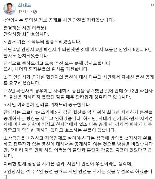 최 시장은 12일 자신의 sns에 관내 거주하는 9 ∼ 12번까지 4명의 코로나19 확진자 정보를 상세하게 공개했다.