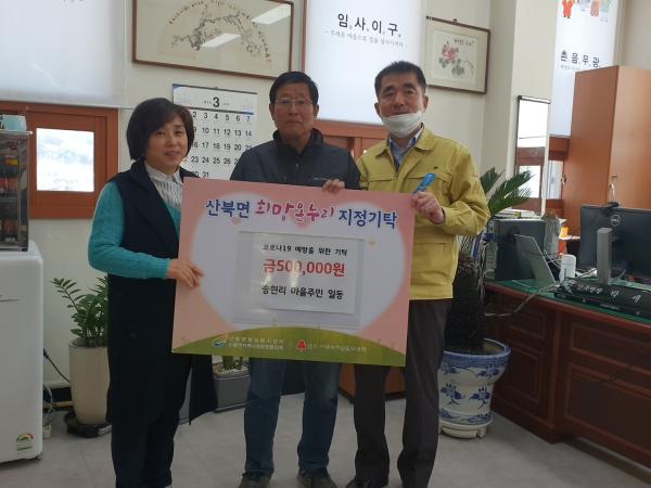먼저 송현리 이장 김영림은 매일 청정지역 산북을 유지 하기위해 애쓰는 산북면행정복지센터 직원들의 노고를 표하며 “코로나19 예방을 위해 마을 주민이 자발적으로 참여해 기부하게 됐다”고 말했다.