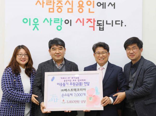 이날 기흥구 지곡동 소독제 제조업체 베스트텍코리아가 감염병에 취약한 어르신들에게 전해달라며 3850만원 상당의 손소독제 7000개를 기탁했다.