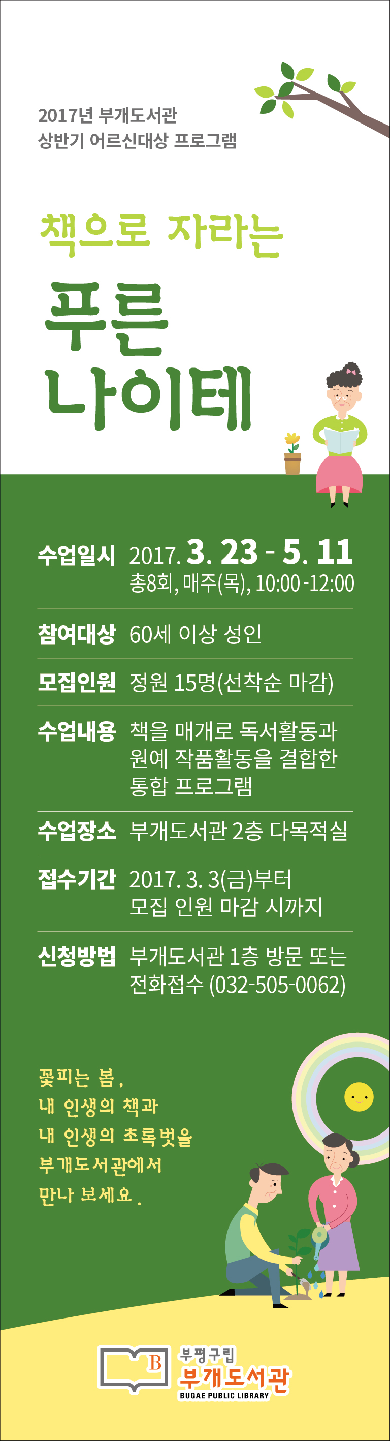 [미디어타임즈=문상수 기자] 부평구(구청장 홍미영) 부개도서관은 지역의 정보소외계층 어르신을 대상으로 독서 자료에 대한 보편적 접근 기회를 확대·제공하고자, 오는 23일부터 매주 목요일 총 8회에 걸쳐 ‘책으로 자라는 푸른나이테’ 프로그램을 운영한다.이번 프로그램은 ▲어르신 대상 도서관 이용 교육 ▲큰활자도서, 오디오북 등 다양한 독서 자료 읽기 ▲이와 연계한 원예 작품 활동 등 다양한 커리큘럼으로 구성돼 있다.노년 생활에 독서의 즐거움을 제공하고, 나만의 원예 작품을 만들며 성취감을 느낄 수 있도록 하기 위해 기획됐으며 오전 10시부터 진행한다. 참여를 원하는 사람은 부개도서관을 방문하거나 전화(☎505-0062~4)로 접수하면 된다. 선착순 15명을 대상으로 무료로 진행한다.자세한 사항은 부개도서관 누리집(www.bppl.or.kr) 공지사항을 참고하면 된다.문의. 부개도서관 032)505-0062~5.