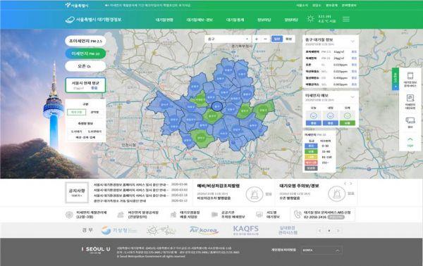 개편된 대기환경정보 홈페이지는 메인화면에 서울시 대기질 측정정보 및 측정소 위치정보를 한 눈에 확인할 수 있도록 지도기반으로 전면 배치하고 서울시 평균값과 구별 측정값을 표기해 간결하고 직관적인 구성의 디자인을 통해 정보전달력과 가독성을 높였다.