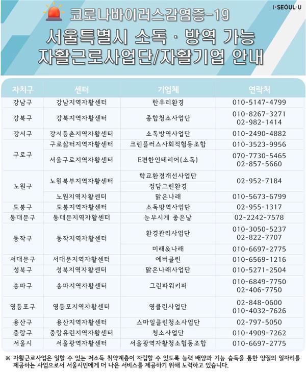 또 일반 가정이나 가게 등 생활공간에도 소독·방역을 하고 싶지만 업체 정보 등을 찾기 어려운 시민들을 위해 19개 자활사업체 리스트도 온라인으로 공개했다.