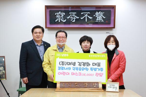 별내동에 소재한 ㈜미넴은 16일 시장 집무실에서 코로나19 확산 예방을 위한 보건용 어린이 마스크 14,000매를 동부희망케어센터에 전달했다.