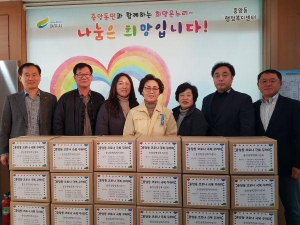 코로나 극복 꾸러미는 민주평화통일자문회의 여주시협의회에서 기탁해준 비타민을 포함해 중앙동통장협의회를 비롯한 중앙동 6개단체에서 후원한 물품인 사골곰탕 3개, 조미김 4개, 라면 1팩, 손소독제로 구성되어 있다.