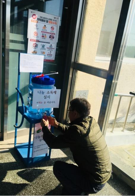 지난 16일부터 대신면 행정복지센터에서는 행정복지센터 입구에 살균소독제 통을 설치해 소독제 무료 나눔을 실시했다.