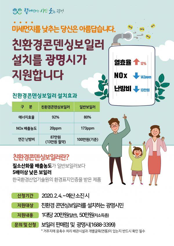 지원 대상은 광명시에 거주하는 시민으로 친환경 콘덴싱보일러를 설치할 경우에 보조금을 지원하며 2020년에는 일반 4,500대, 저소득층 40대를 지원한다.