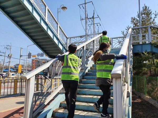 평택시 청북읍은 코로나19 확산방지를 위해 이장, 읍사무소 직원 등이 참석한 가운데 지난 14일 주말에도 약국, 어린이놀이터, 교회, 농협ATM기, 버스정류장, 육교 등에 방역 소독을 실시했다.