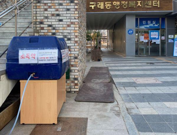 구래동행정복지센터 청사 앞에 비치돼 있는 소독제는 개별 용기만 지참하면 누구나 시간제약 없이 담아 갈 수 있고 방역용 소독 분무기는 구래동 주민에 한해 업무시간 내 선착순으로 무료 대여가 가능하다.