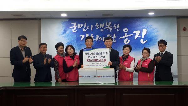 옹진군은 17일 오후 2시 군청 소회의실에서 인천옹진농협과 영흥농가주부모임으로 부터 코로나19 예방을 위한 보건용마스크 800매를 기부 받았다고 밝혔다.