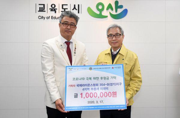 오산시는 17일 코로나 19 극복을 위해 국제라이온스협회 354-B지구 4지역에서 후원금 100만원을 기탁했다고 밝혔다.