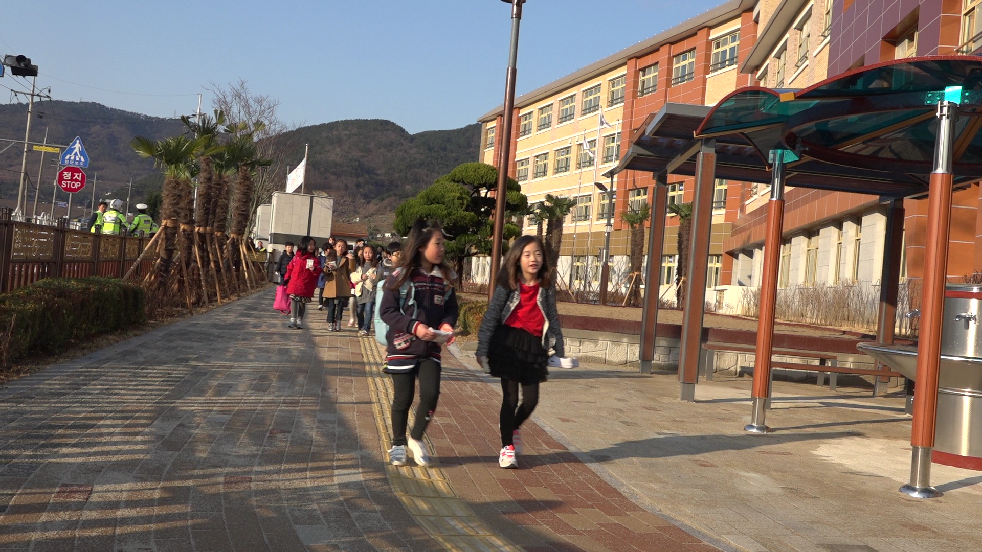 | 장평초등학교에서의 임시 이전을 끝내고 교사 신축을 통한 재개교로 등교하는 기성초 학생들(사진=거제교육지원청 제공) |