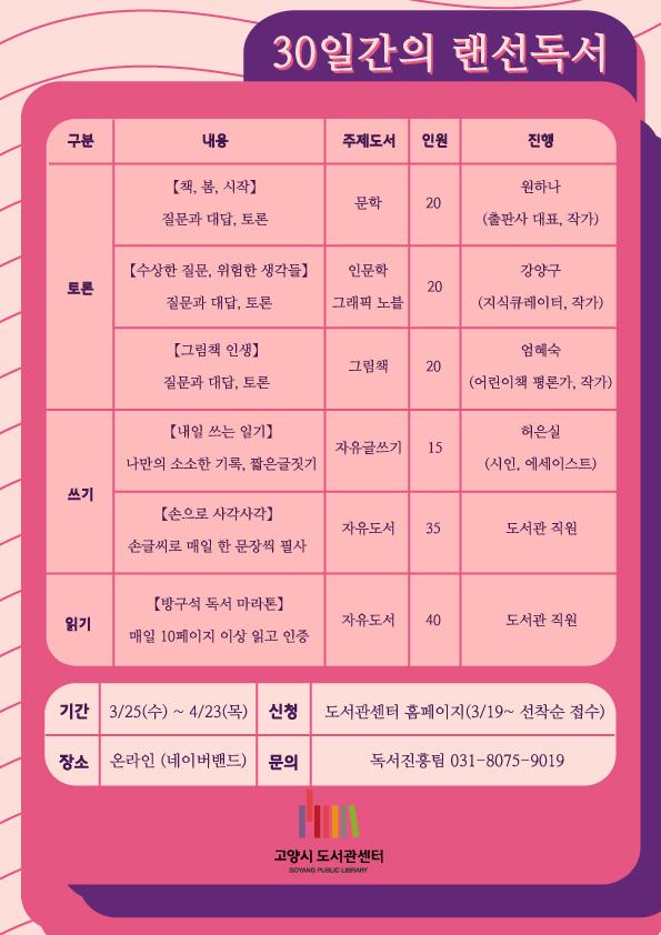 센터는 오는 25일부터 4월 23일까지 한 달 간, SNS를 통해 책을 읽고 쓰고 토론하는 온라인 독서 프로그램인‘30일간의 랜선 독서’프로젝트를 추진한다고 밝혔다.