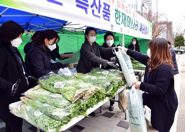윤화섭 안산시장은 지난 17일 시청 광장에서 열린 청도군 특산품 한재미나리 특판행사장을 찾아 미나리를 구매했다.