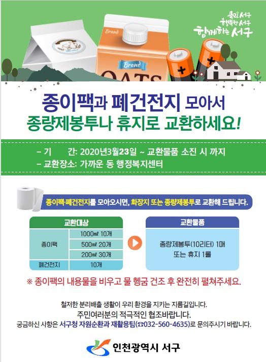 인천 서구는 종이팩과 폐건전지를 휴지 또는 종량제봉투로 교환해주는 사업을 오는 23일부터 추진한다고 밝혔다.