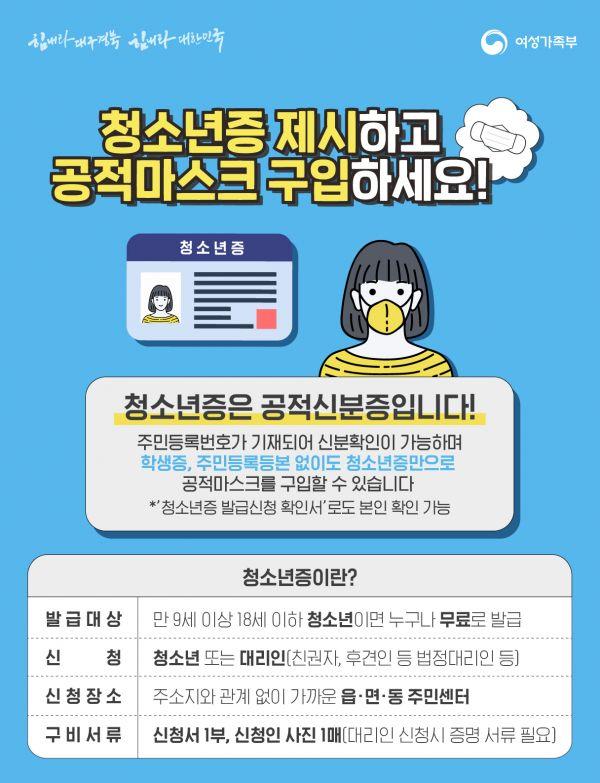 청소년증은 공적 신분증으로 주민등록번호가 기재되어 신분확인이 가능하며 학생증, 주민등록등본 없이도 청소년증만으로 공적 마스크를 구입할 수 있다.