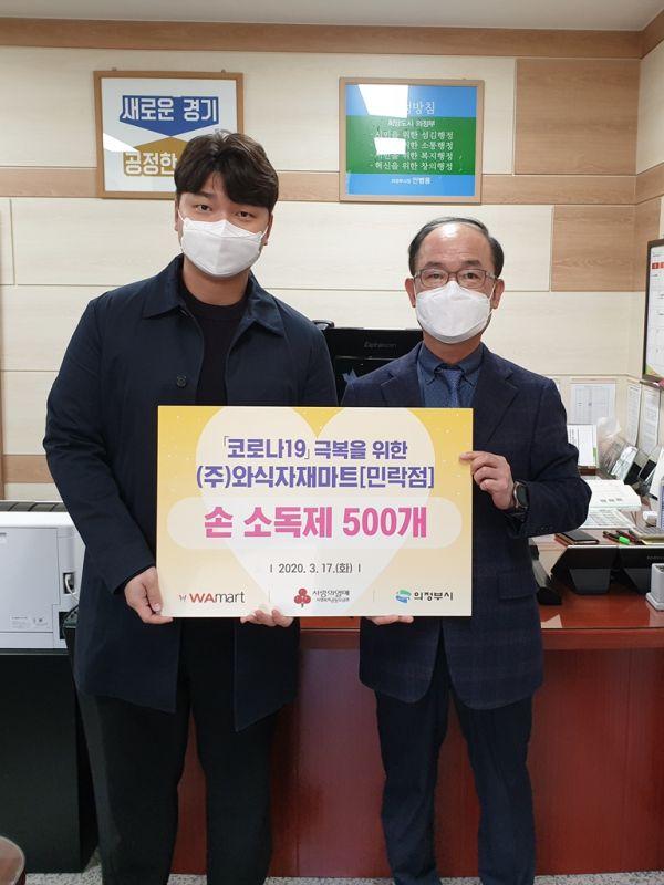 ㈜와식자재마트 민락점은 지난 17일 코로나19 확산을 방지하고 지역사회에 도움울 주기 위해 의정부시에 손 소독제 500개를 기탁했다.