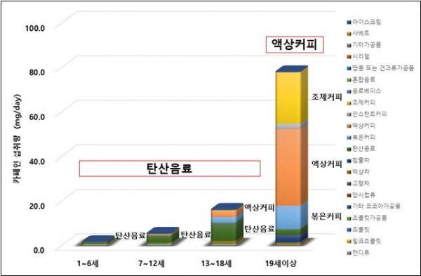 카페인 섭취의 주요 기여 식품으로는 성인의 경우 액상커피, 청소년·초등학생·미취학 어린이는 탄산음료로 나타났다.