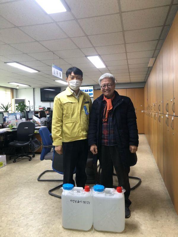 농업회사법인 ㈜골드부르어스가 코로나19 확산방지와 극복을 위해 지난 17일 금사면행정복지센터를 방문해 10만원 상당의 살균 소독수 20L 2통을 기탁했다.