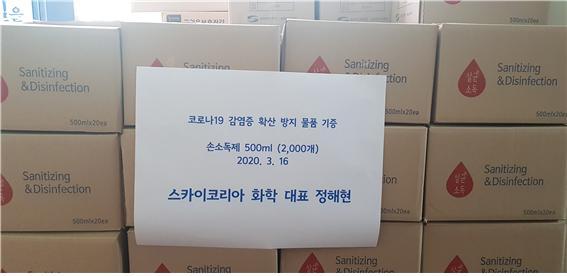 ㈜스카이코리아는 지난 16일 코로나19의 확산방지와 김포시민의 안전을 위해 김포시에 2,000만원 상당의 손소독제를 기부했다.