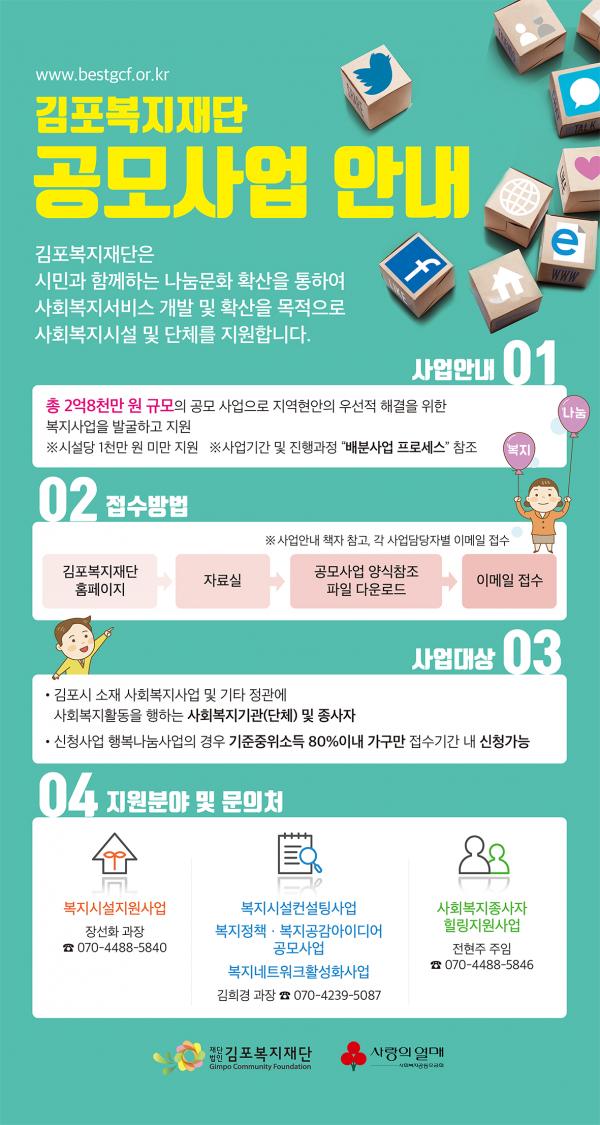 이번 공모사업은 약 2억 8천만원의 지원사업 규모로 김포시민과 기업, 단체들이 기부한 성금을 투명하고 공정하게 지원하기 위함이다.
