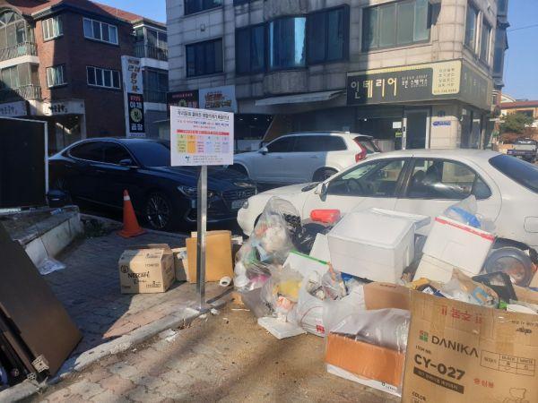 안내표지판에는 해당 지역의 요일·종류별 올바른 쓰레기 배출 방법을 포함해 생활쓰레기 수거 업체 및 연락처가 상세히 표기돼 있다.