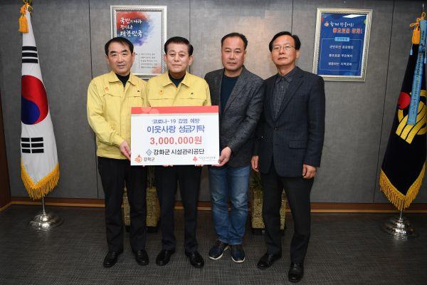 강화군시설관리공단은 코로나19 확산방지와 위기극복을 위해 임직원이 자발적으로 나서 자체방역활동, 강화대교·초지대교 발열검사 지원, 성금 기탁 등 전방위적인 지원활동을 펼치고 있다.