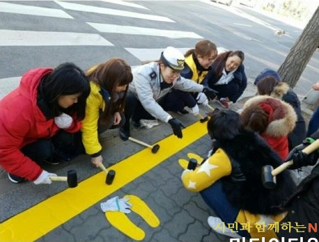 | 부평녹색어머니연합회 30여명과 함께 산곡북초등학교에 신학기를 맞아 어린이 교통안전 확보를 위한“노란발자국”을 설치하는 모습. <ⓒ미디어타임즈> |