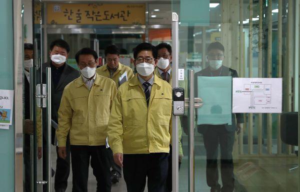 신종 코로나바이러스 감염증 여파로 전국 유치원과 초·중·고등학교 개학이 다음 달 6일로 연기된 가운데, 양승조 충남도지사가 초등학생 긴급 돌봄 현장을 찾아 방역 및 운영 현황을 살폈다.