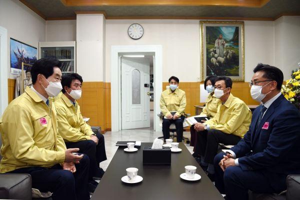 안병용 의정부시장은 18일 코로나19의 지역 확산 방지를 위한 집회 및 예배 자제 협조 당부를 위해 의정부기독교연합회 회장이 담임목사로 있는 순복음의정부교회를 방문했다.