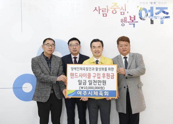 여주시체육회는 18일 여주시청 시장실에서 장애인체육회 에 핸드사이클 장비구입 지원을 위한 1천만원의 후원금을 전달했다.