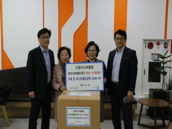 이 날 기부는 고양시니어클럽의 ‘할머니와 재봉틀’ 사업단 10명의 어르신들과 자원봉사자 어르신 1명이 함께 참여해 지난 9일부터 17일까지 일주일간 열심히 만든 면마스크 전부를 고양시에 전달했다.