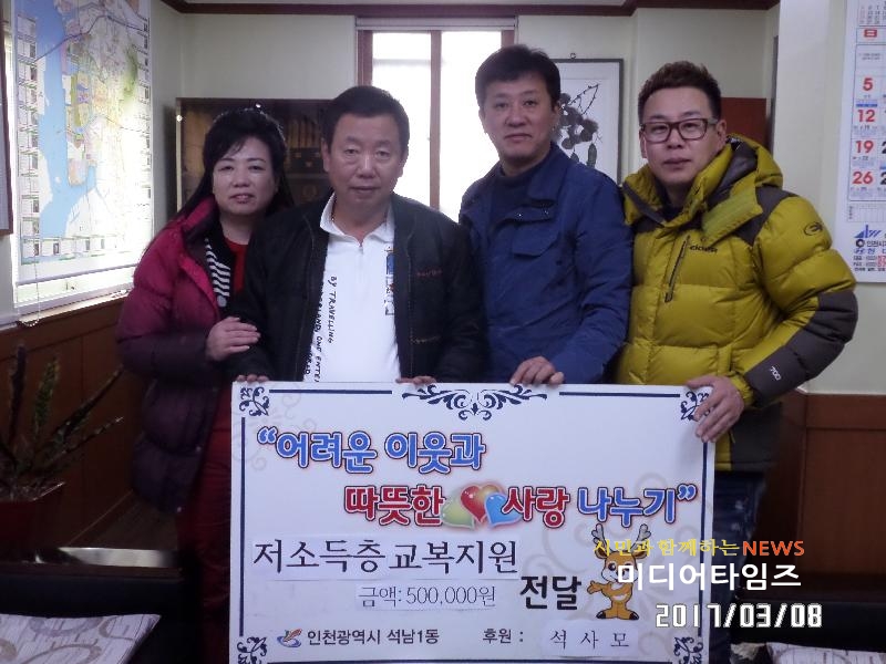 [미디어타임즈=홍기연 기자] 석남동을 사랑하는 사람들의 모임(회장 김영동, 이하 석사모)은 지난 8일 저소득가정 청소년의 교복비 지원을 위한 50만원 기탁금을 석남1동 지역사회보장협의체에 전달했다.