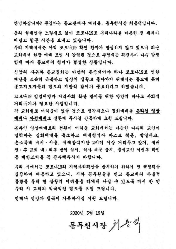 최용덕 동두천시장은 “동두천시는 코로나19 확진자가 없는 청정지역으로 공무원과 시민 모두가 합심해 안전을 사수하고 있으니, 예배나 집회, 행사 등을 당분간 중단해주시고 필요하다면 영상 등의 방법을 활용해주시기를 부탁드린다”고 당부했다.