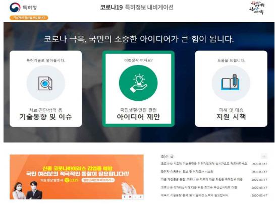 그 외에 코로나19 내비게이션 서비스는 코로나19 극복을 위한 국민들의 다양한 제안, 우수 발명 아이디어도 접수받고 있으며 코로나19로 피해를 입고 있는 기업들을 위한 특허청의 다양한 지원시책도 안내하고 있다.