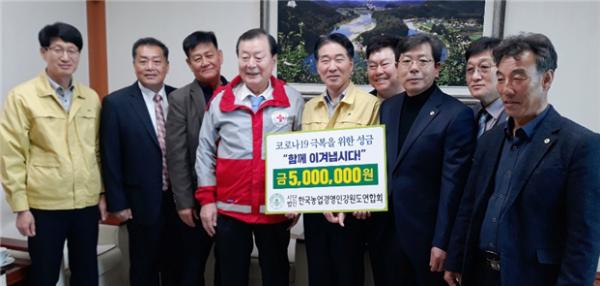 한국농업경영인 강원도연합회는 19일 강원도청에서 코로나19 피해지역 구호 성금 오백만원을 대한적십자사 강원지사에 기탁했다.