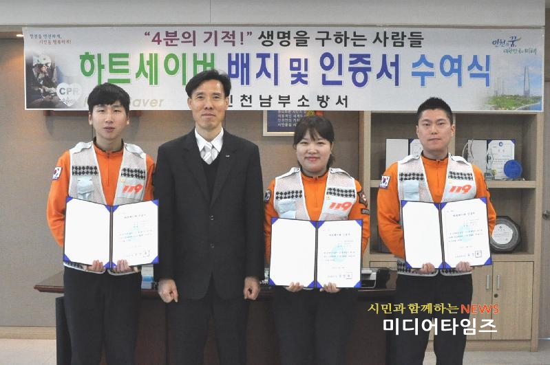 [미디어타임즈=문상수 기자] 인천남부소방서(서장 김성기)는 10일 본서 서장실에서 심폐소생술을 이용해 심정지 환자를 소생시킨 도주영 대원 등 3명에게 하트세이버 인증서를 수여했다.하트세이버(Heart Saver)란 심폐소생술로 심장을 소생시킨 사람, 즉 인명을 소생시킨 사람이란 뜻으로 호흡 및 심정지 등으로 위험에 놓인 응급환자에 빠르고 정확한 대처로 생명을 구한 사람에게 수여하는 상으로 ‘생명 지킴이‘라 불린다.이들은 호흡과 맥박이 없는 심장이 정지된 요구조자를 적극적인 심폐소생술과 자동제세동기를 사용하여 심장을 다시 뛰게 한 구급대원으로 자긍심을 고취시키기 위해 인증서를 수여했다.김성기 인천남부소방서장은 “구급대원이라는 사명감으로 귀중한 생명을 살리기 위해 최선의 노력을 다해 준 대원들에게 격려와 함께, 앞으로도 더 많은 생명을 소생 시킬 수 있도록 심폐소생술 보급에 최선의 노력을 다해 나갈 것"이라고 말했다.
