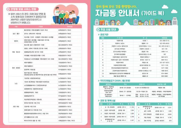 또한, 건강과 여가생활을 위해 이용할 수 있는 관내 근린공원, 어린이공원, 문화공원, 풋살장, 탁구장 등의 공원 및 체육시설은 물론 자금동 주민자치센터 수강 프로그램과 작은도서관 이용방법 등이 안내되어 있다.