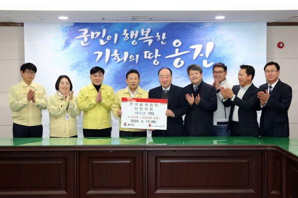 옹진군은 지난 19일 군청 소회의실에서 한국골재협회 인천지회로부터 면 마스크 6천500매를 기부 받았다고 밝혔다.