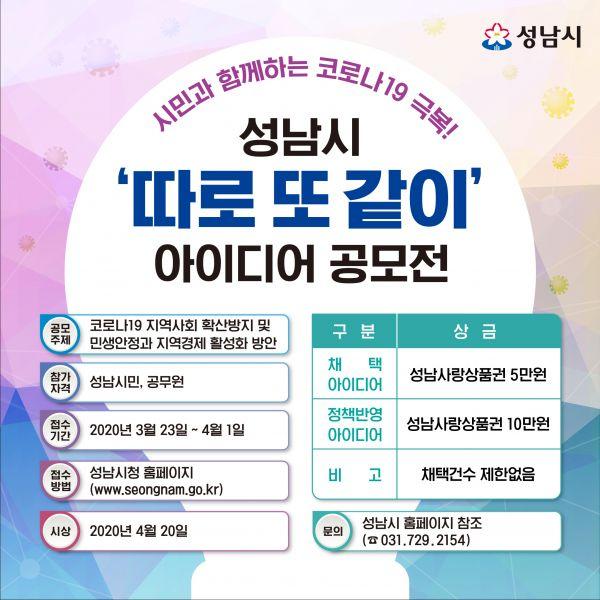 성남시는 오는 3월 23일부터 4월 1일까지 시민과 함께 코로나19 극복 방안을 마련하기 위한 ‘따로 또 같이’ 아이디어 공모를 진행한다.